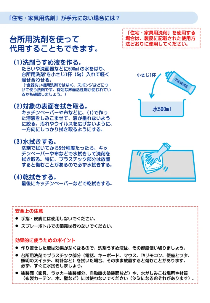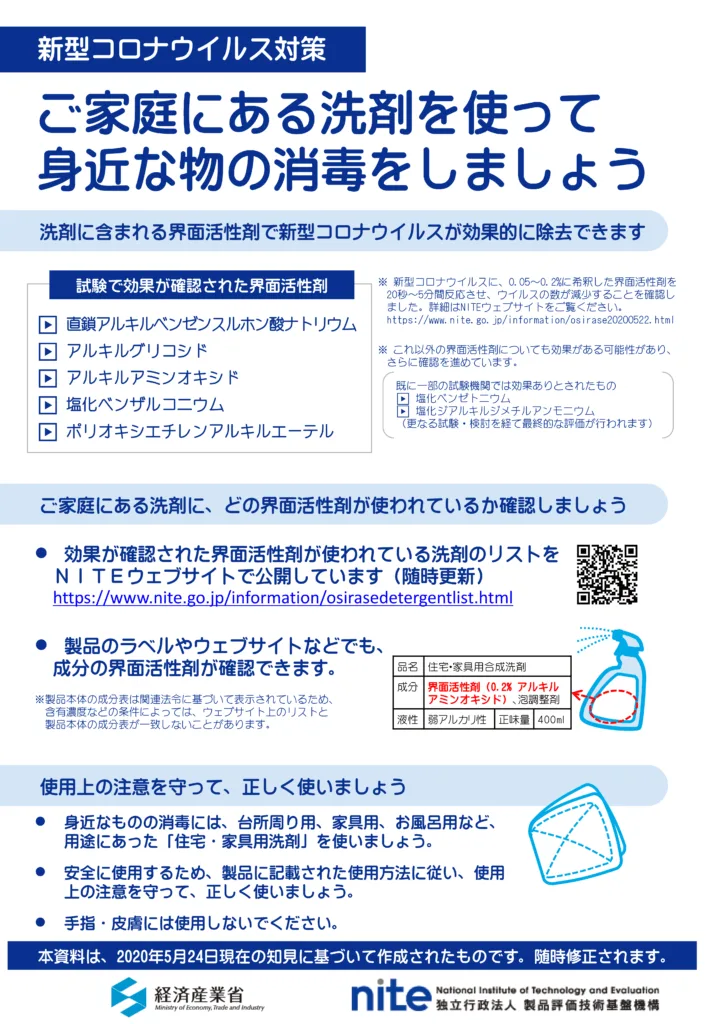 新型コロナウイルスに有効な食器用洗剤や住宅用洗剤についてはは独立行政法人製品評価技術基盤機構 NITE(ナイト)にて最新情報が確認できます。