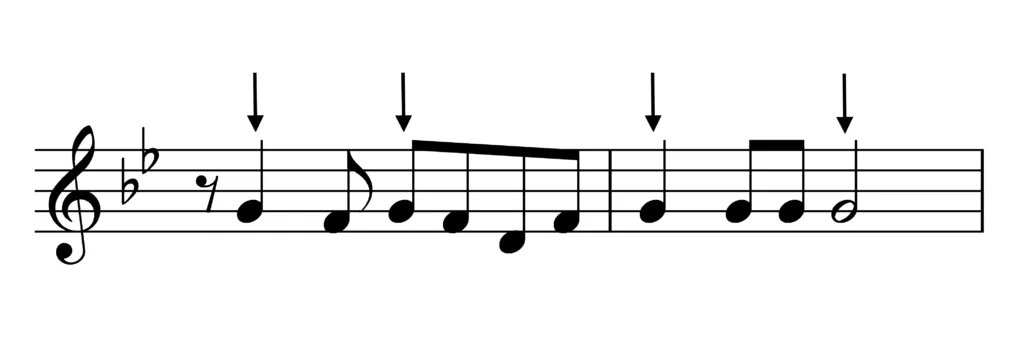 つづく2小節目では1,3拍目に長い音がくるので安定感があります。