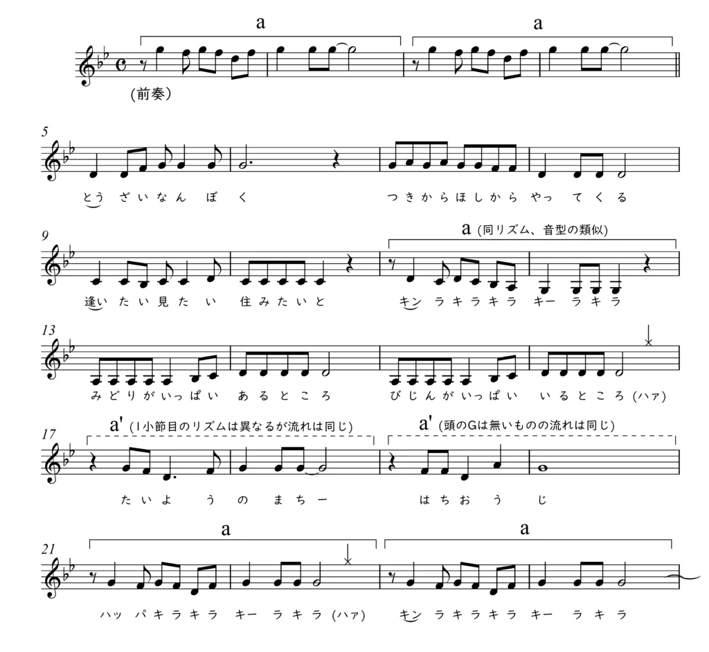七五調で語呂がいい上に、繰り返される「キラキラ」は2回目に「キーラキラ」と引き伸ばされます。